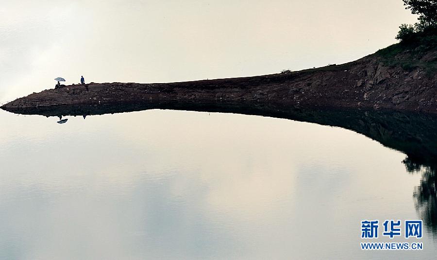 7月10日,垂釣愛(ài)好者在湖北省恩施土家族苗族自治州宣恩縣雙龍湖畔撐傘釣魚(yú)。垂釣者腳下的小島,猶如一把寶劍伸向湖心。 新華社發(fā)(宋文攝)
