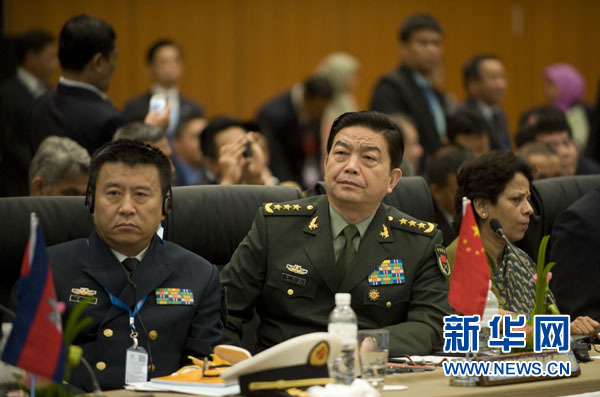 8月29日,在文萊斯里巴加灣市,中國國務(wù)委員兼國防部長常萬全(中)出席第二屆東盟防長擴大會議。新華社記者 呂小煒 攝