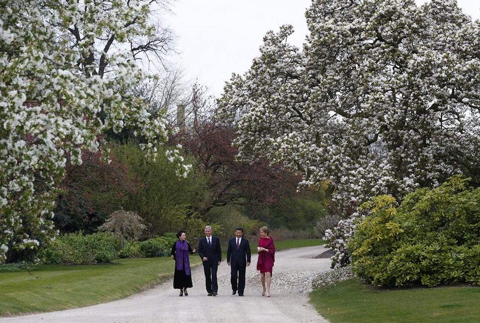 當(dāng)時(shí)時(shí)間3月30日,布魯塞爾,習(xí)近平夫婦與比利時(shí)國王王后在皇宮散步。
