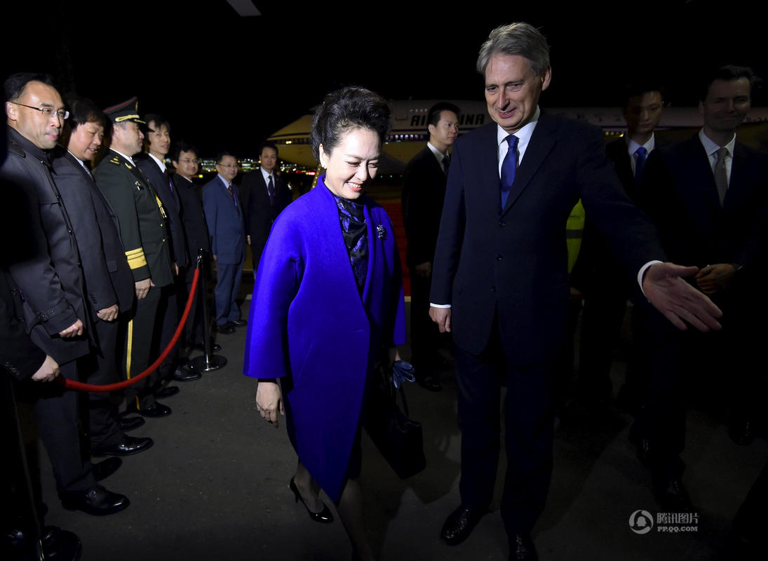英國外交大臣哈蒙德護送彭麗媛。 |