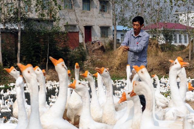 。ㄔ趪壹壺毨Эh河南省淮濱縣,王店鄉(xiāng)宋營村村民趙懷糧在給大白鵝喂飼料。馮大鵬2015年10月21日攝。趙懷糧利用“惠民扶貧貼息小額擔保貸款”搞起了養(yǎng)殖業(yè),在家門口就可以逐漸實現脫貧。)