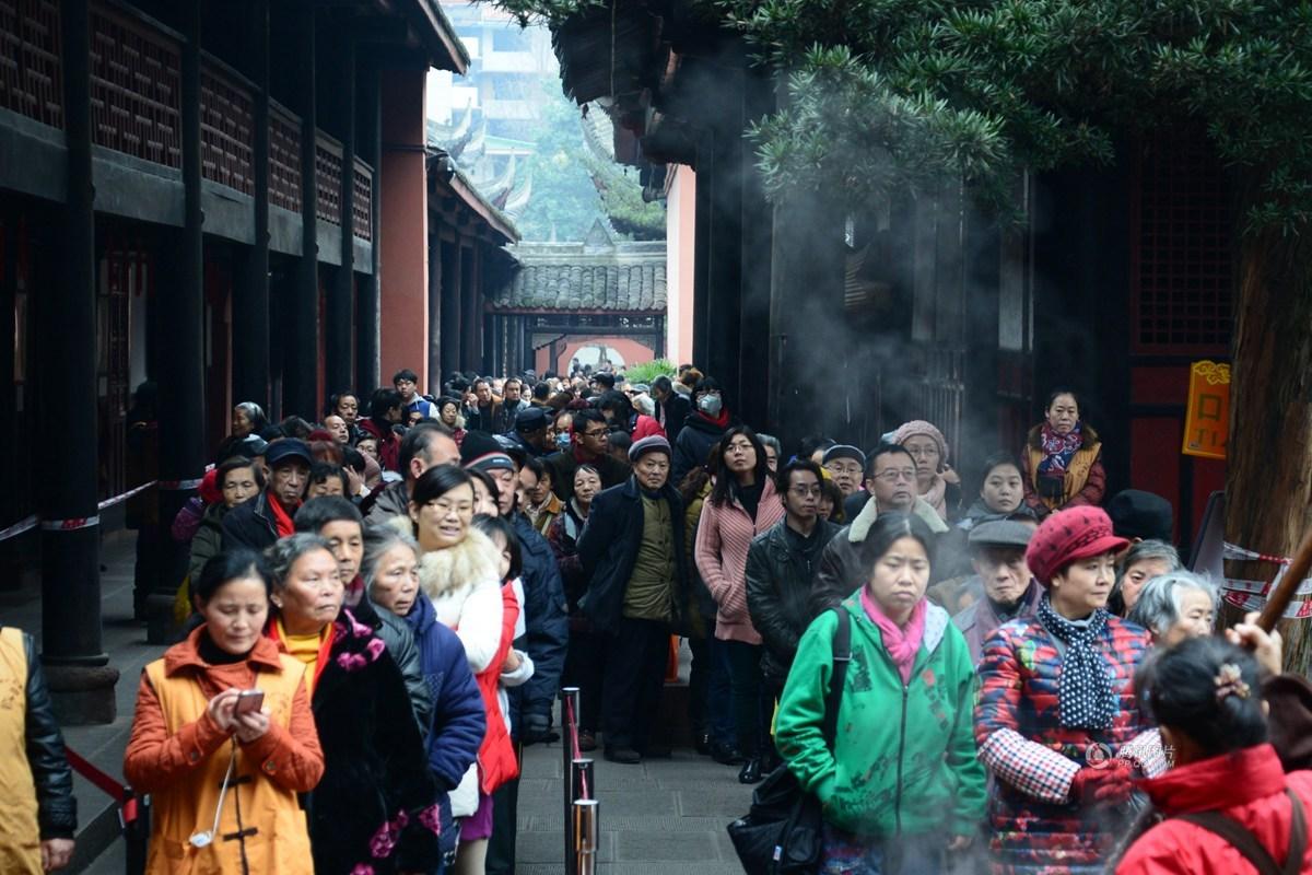 四川省成都市,上萬成都市民和游客前往文殊院“臘八粥”發(fā)放點排隊領(lǐng)取品嘗免費的臘八粥。廖力/東方IC