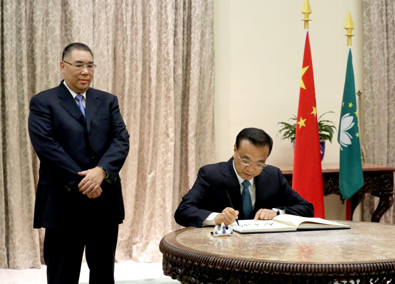 【李克強視察澳門特區(qū)政府總部并聽取匯報】李克強總理10日下午視察澳門特區(qū)政府總部,與特區(qū)政府主要官員合影,并在嘉賓簽名冊上簽名。在聽取崔世安行政長官及特區(qū)政府5位司長的工作匯報后,李克強作了重要講話。他說,中央政府最近根據(jù)新形勢下澳門發(fā)展的新需求,提出了多項惠澳政策。