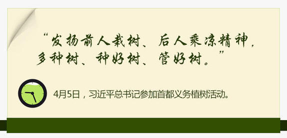 習近平總書記強調,發(fā)展林業(yè)是全面建成小康社會的重要內容,是生態(tài)文明建設的重要舉措。各級領導干部要帶頭參加義務植樹,身體力行在全社會宣傳新發(fā)展理念,發(fā)揚前人栽樹、后人乘涼精神,多種樹、種好樹、管好樹,讓大地山川綠起來,讓人民群眾生活環(huán)境美起來。
