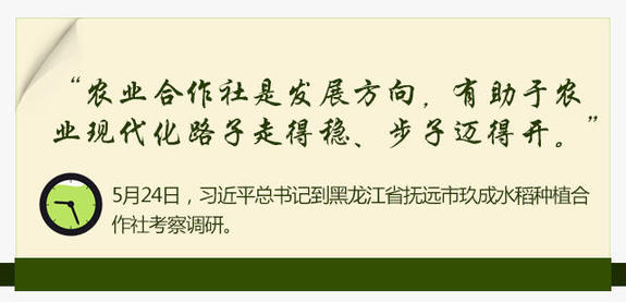 5月24日,習近平總書記來到黑龍江省撫遠市玖成水稻種植合作社考察調研時,親自登上插秧機,詢問當地村民的收入、土地流轉等情況。他指出,農民專業(yè)合作社是帶動農戶增加收入、發(fā)展現(xiàn)代農業(yè)的有效組織形式,要總結推廣先進經驗,把合作社進一步辦好。
