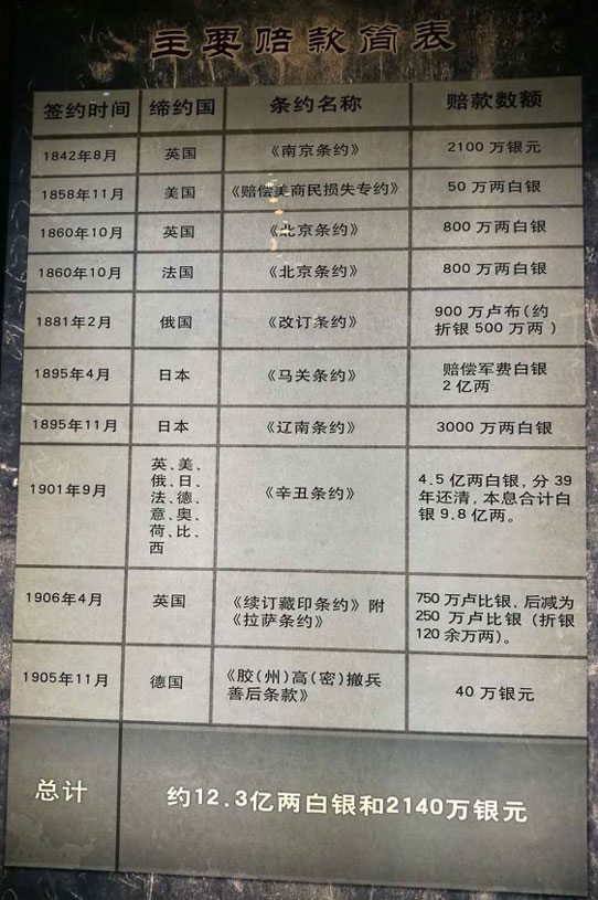 還有一份更沉重的統(tǒng)計數(shù)據(jù):自1840年第一次鴉片戰(zhàn)爭起至1949年新中國成立止,外國侵略者強加給中國人民的不平等條約共計1182個;自鴉片戰(zhàn)爭到清政府垮臺的70年中,中國僅賠償一項連本帶利總數(shù)達16億兩白銀,平均每年負擔(dān)對外賠款2285.7萬兩。