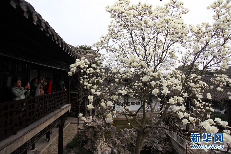 3月18日,游客在江蘇揚(yáng)州何園景區(qū)觀賞玉蘭花。 氣溫回升,玉蘭花迎春綻放,生機(jī)盎然。 新華社發(fā)(孟德龍 攝)