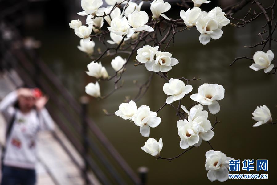 3月18日,一名游客在江蘇揚(yáng)州何園景區(qū)拍攝玉蘭花。 氣溫回升,玉蘭花迎春綻放,生機(jī)盎然。 新華社發(fā)(孟德龍 攝)