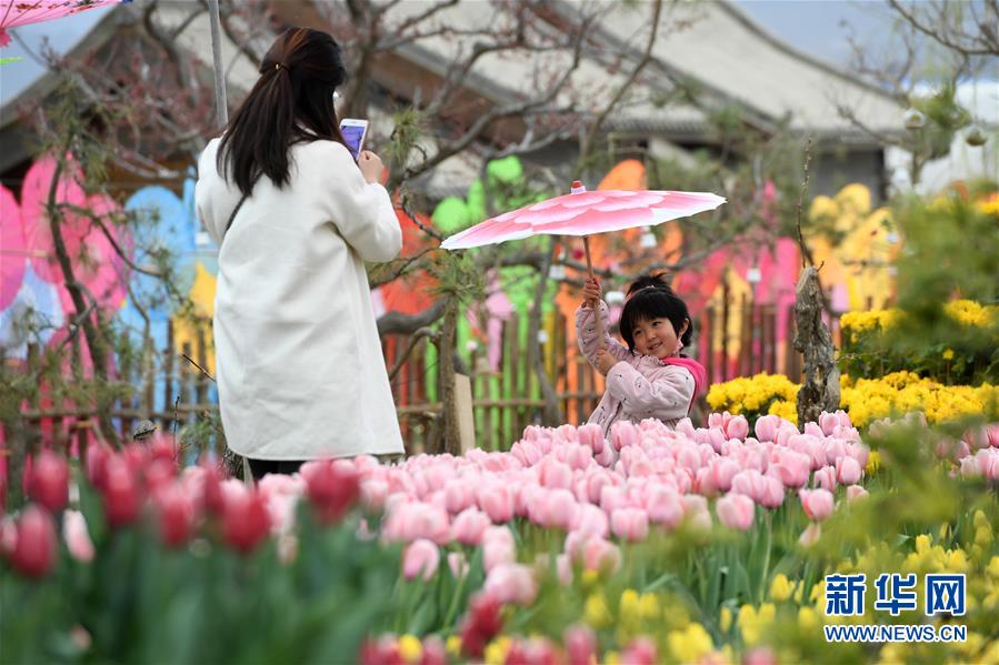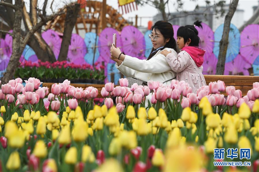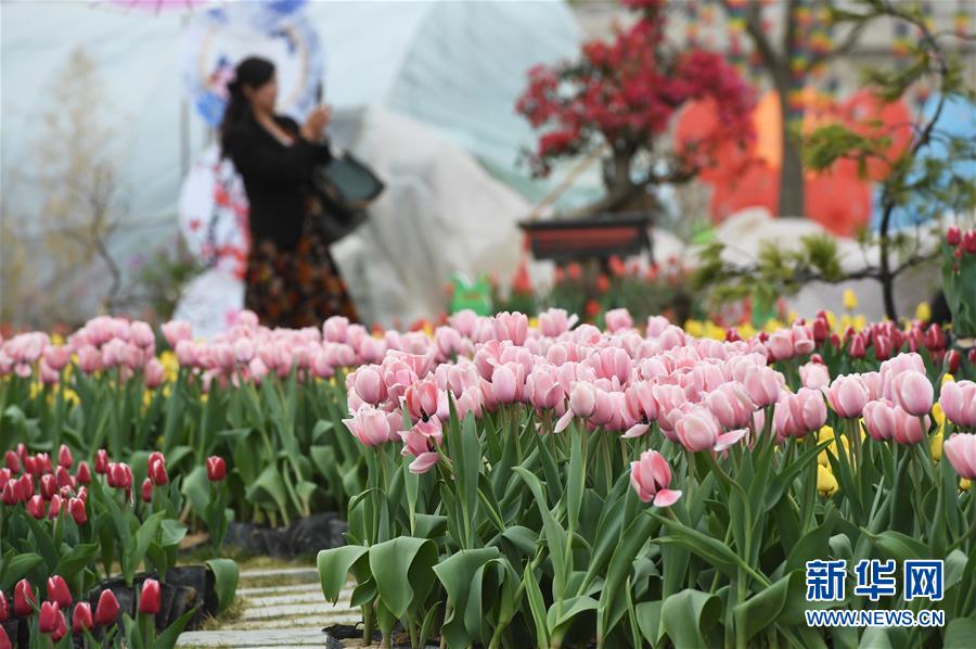 4月8日,在榆中縣李家莊田園綜合體內(nèi),游客在郁金香花叢中拍照留念。新華社記者范培珅攝