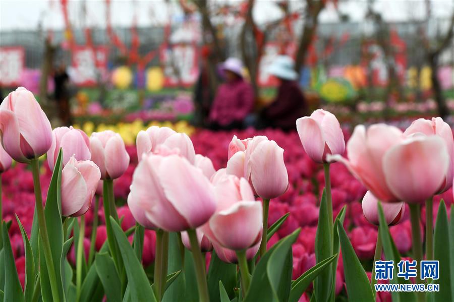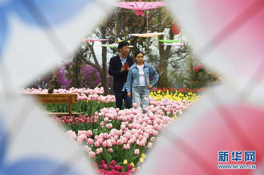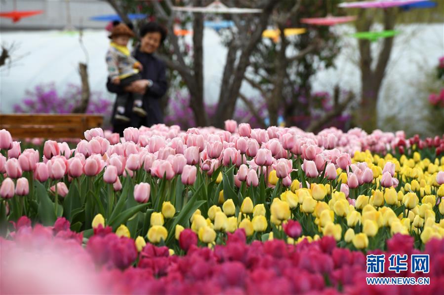 4月8日,在榆中縣李家莊田園綜合體內(nèi),游客在郁金香花叢中賞花。新華社記者范培珅攝