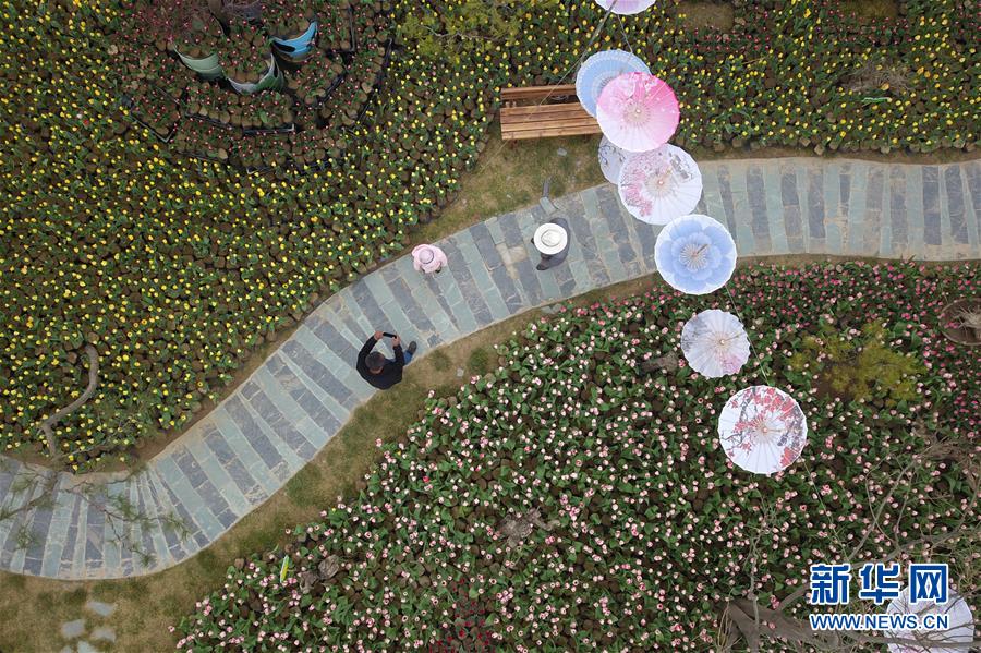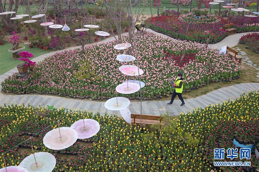 在榆中縣李家莊田園綜合體內(nèi),游客欣賞綻放的郁金香(4月8日無人機拍攝)。 新華社記者范培珅攝