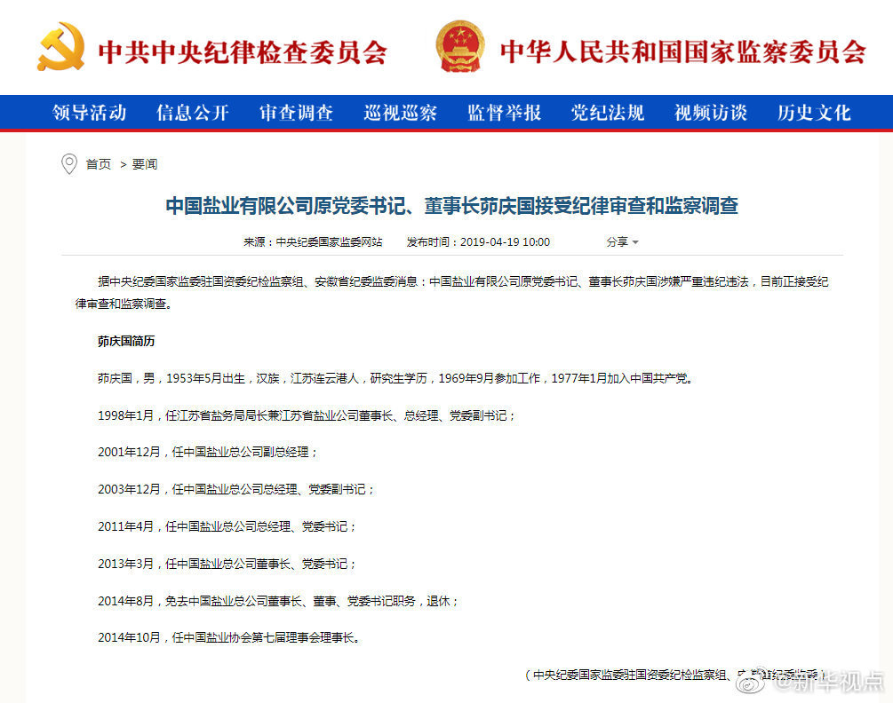 據(jù)中央紀(jì)委國家監(jiān)委駐國資委紀(jì)檢監(jiān)察組、安徽省紀(jì)委監(jiān)委消息:中國鹽業(yè)有限公司原黨委書記、董事長茆慶國涉嫌嚴(yán)重違紀(jì)違法,目前正接受紀(jì)律審查和監(jiān)察調(diào)查。