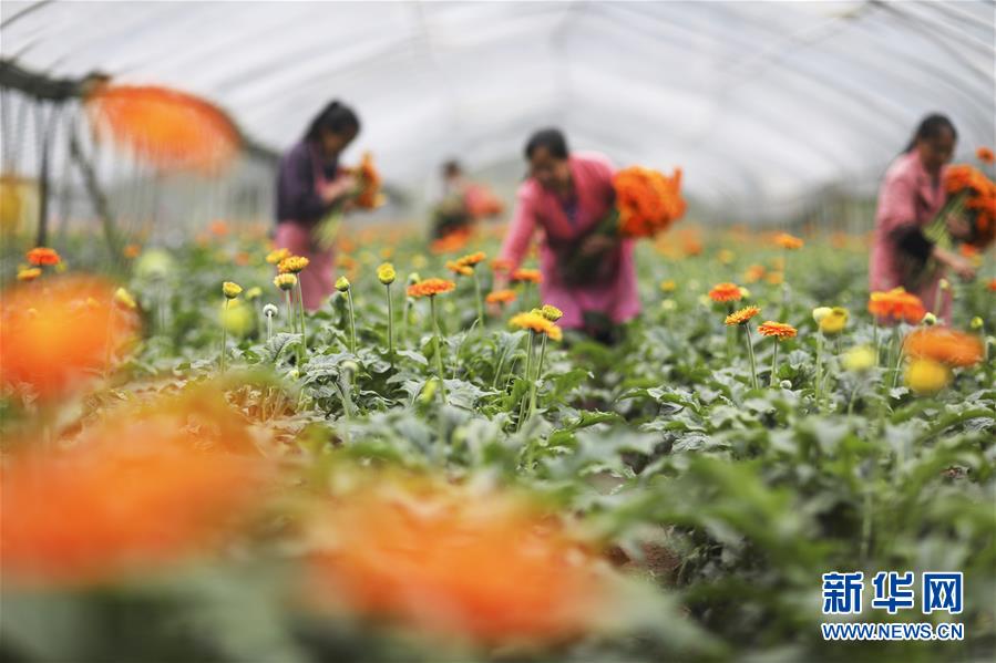 5月18日,在貴州省赤水市寶源鄉(xiāng)聯(lián)奉村的鮮花種植基地,村民在采收非洲菊。 新華社發(fā)(王長育 攝)