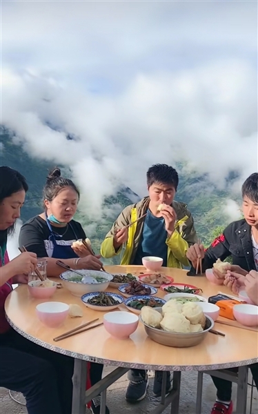 視頻里,一張小方桌支起,三位村民端菜上桌,而他們背后則是翠綠蒼茫的大山,懸浮在半空的團(tuán)團(tuán)云霧,以及云霧縫隙里的層層梯田。被網(wǎng)友們稱為“云端餐廳”。