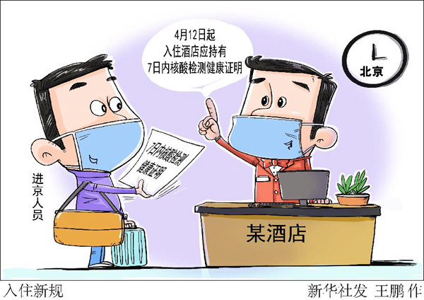 周衛(wèi)民說,4月12日起,進京人員入住酒店,應(yīng)持有7日內(nèi)經(jīng)當(dāng)?shù)睾怂釞z測呈陰性的健康證明,且全國健康通行碼或北京健康寶認證為“未見異!睜顟B(tài),同時要按要求登記在京聯(lián)系人,接受酒店健康管理。酒店要嚴格落實疫情防控責(zé)任,檢查旅客提供的核酸檢測健康證明并監(jiān)督其如實填報入住信息,對旅客進行早晚體溫檢測,密切關(guān)注旅客健康狀況。公安部門要繼續(xù)加大對虛假填報信息和核酸檢測健康證明造假等行為的查處力度,嚴厲打擊違法行為。