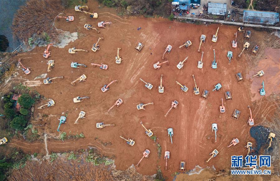 大型機械在武漢火神山醫(yī)院建設(shè)工地施工(1月24日攝,無人機照片)。 新華社記者 肖藝九 攝