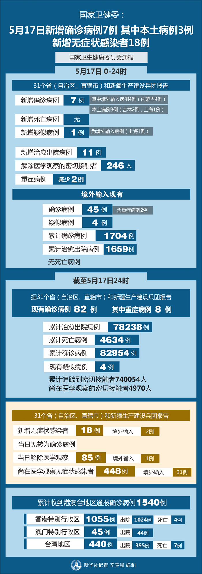 截至5月17日24時(shí),據(jù)31個(gè)。ㄗ灾螀^(qū)、直轄市)和新疆生產(chǎn)建設(shè)兵團(tuán)報(bào)告,現(xiàn)有確診病例82例(其中重癥病例8例),累計(jì)治愈出院病例78238例,累計(jì)死亡病例4634例,累計(jì)報(bào)告確診病例82954例,現(xiàn)有疑似病例4例。累計(jì)追蹤到密切接觸者740054人,尚在醫(yī)學(xué)觀察的密切接觸者4970人。