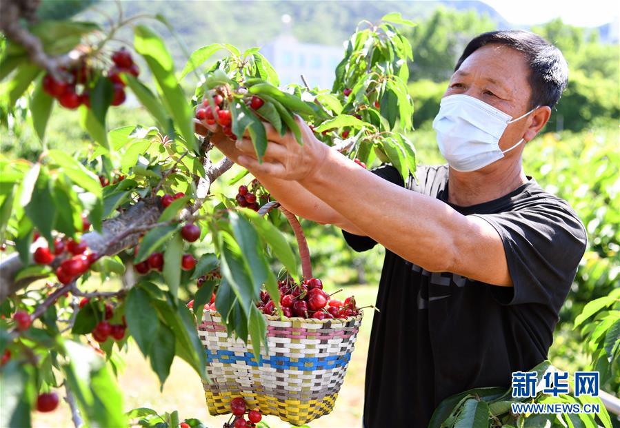 5月20日,北京市海淀區(qū)溫泉鎮(zhèn)楊家莊村櫻桃采摘園的工作人員在采摘櫻桃。