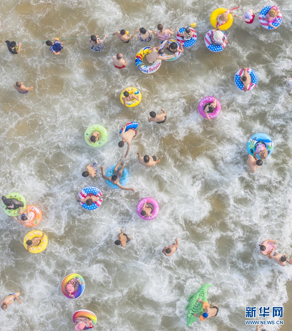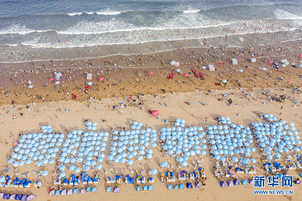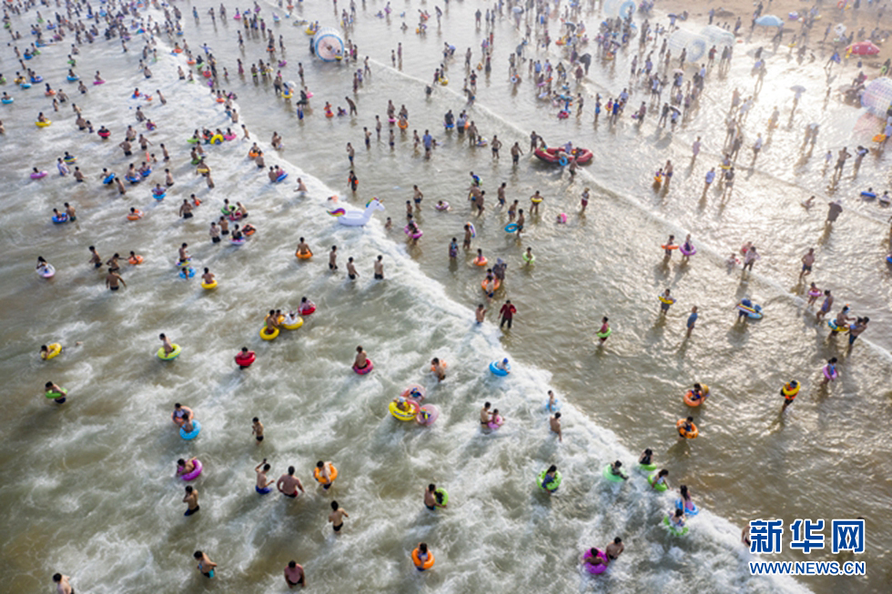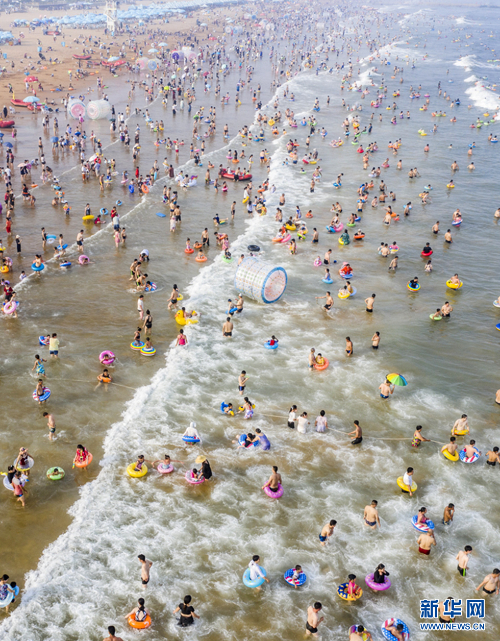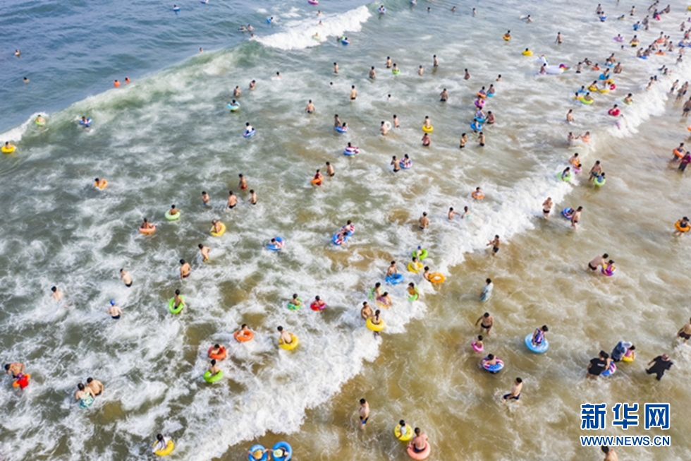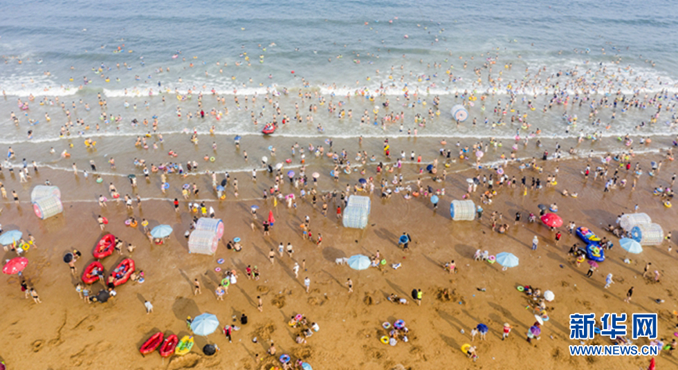近日,山東青島進(jìn)入“燒烤模式”,海濱最高氣溫連續(xù)高達(dá)30℃,數(shù)萬(wàn)游人來(lái)到海水浴場(chǎng)消暑,洗海澡、戲水玩沙。新華網(wǎng)發(fā)(王華 攝)