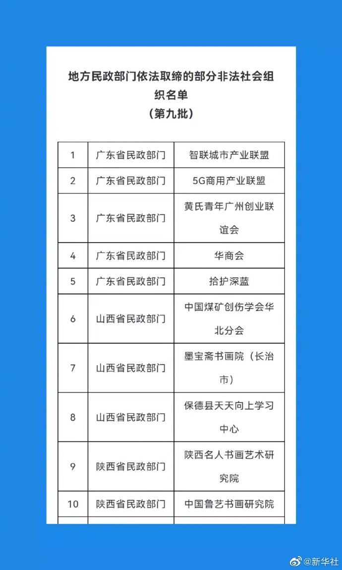 民政部17日公布第九批地方民政部門依法取締的部分非法社會(huì)組織名單。包括5G商用產(chǎn)業(yè)聯(lián)盟、華商會(huì)等28家非法社會(huì)組織“上榜”。民政部再次提醒有關(guān)機(jī)構(gòu)和社會(huì)公眾,在與社會(huì)組織開展合作或參與其活動(dòng)時(shí),請(qǐng)通過“中國(guó)社會(huì)組織政務(wù)服務(wù)平臺(tái)”(www.chinanpo.gov.cn)、“中國(guó)社會(huì)組織動(dòng)態(tài)”政務(wù)微信(微信號(hào):chinanpogov)核實(shí)其身份,避免上當(dāng)受騙。同時(shí),歡迎社會(huì)各界通過“中國(guó)社會(huì)組織政務(wù)服務(wù)平臺(tái)”提供涉嫌非法社會(huì)組織活動(dòng)線索。(記者高蕾)
