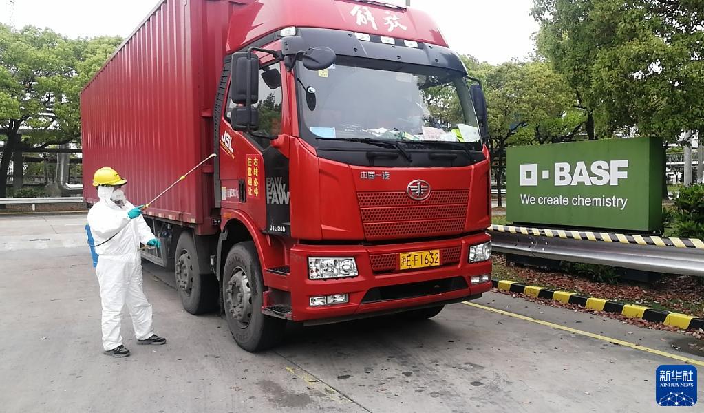 工作人員在位于上海市金山區(qū)的巴斯夫護理化學品(上海)有限公司工廠對貨車進行消殺(4月15日攝)。新華社記者 丁汀 攝