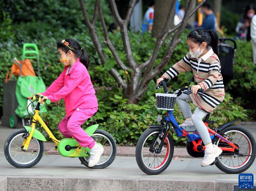 5月17日,在上海市松江區(qū),小朋友們在騎自行車。新華社記者 劉穎 攝