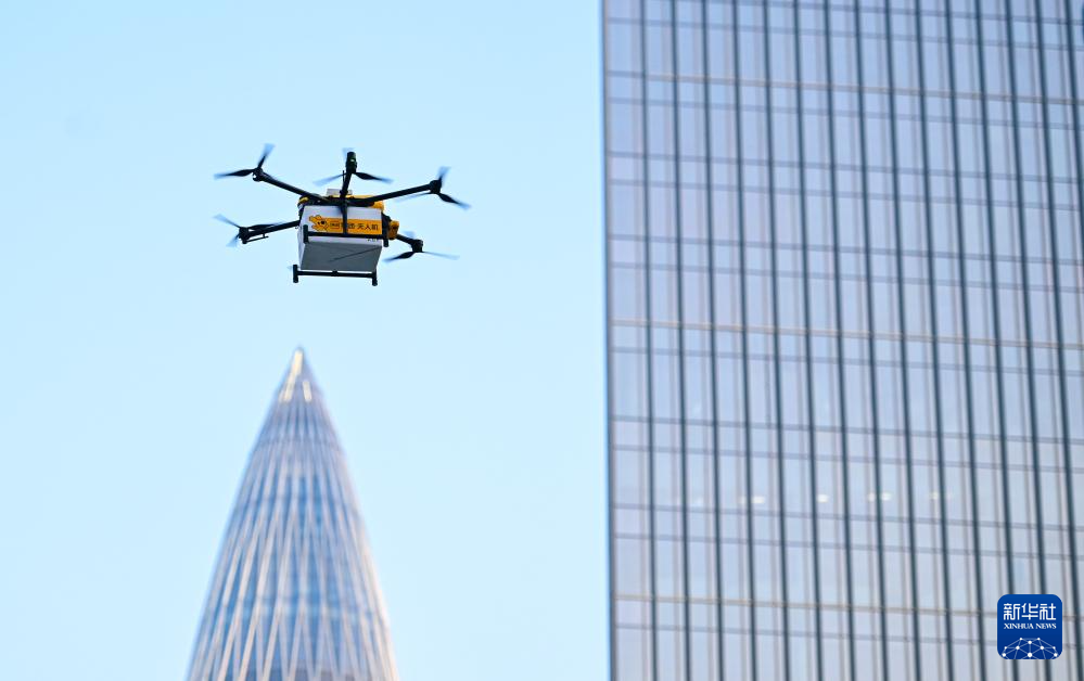 美團(tuán)送餐無(wú)人機(jī)穿行在深圳市后海片區(qū)的樓宇之間(2023年11月24日攝)。新華社記者 毛思倩 攝