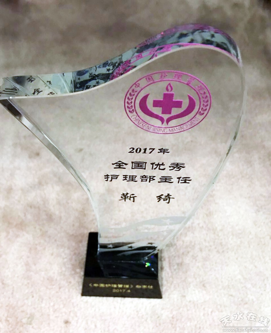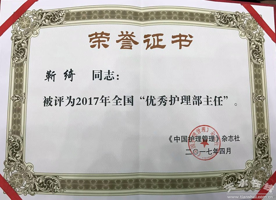 4月26日,在由國家衛(wèi)計(jì)委主辦,,《中國護(hù)理管理》雜志社承辦,在河南鄭州召開的評選全國衛(wèi)生計(jì)生系統(tǒng)先進(jìn)護(hù)理個(gè)人表彰會議上,天水市第一人民醫(yī)院護(hù)理部主任靳綺同志被評為2017年度全國優(yōu)秀護(hù)理部主任,受到嘉獎。