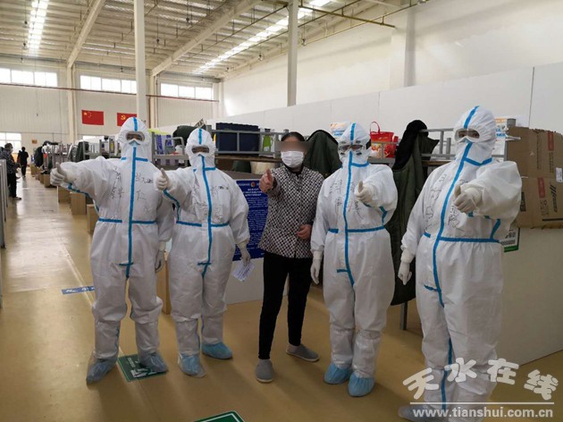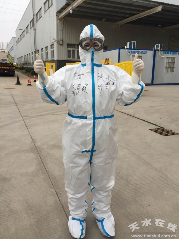 大約40分鐘路程,下午四點(diǎn)左右就到了“戰(zhàn)場(chǎng)”——武漢開(kāi)發(fā)區(qū)沌口方艙醫(yī)院,大家迅速穿齊防護(hù)裝備相互檢查,因?yàn)榇┝朔雷o(hù)服我們都不認(rèn)識(shí)誰(shuí)是誰(shuí)了,就在背后寫(xiě)了:甘肅,天水,姓名,醫(yī)護(hù),加油等字樣,確保無(wú)誤后進(jìn)入了艙內(nèi)。