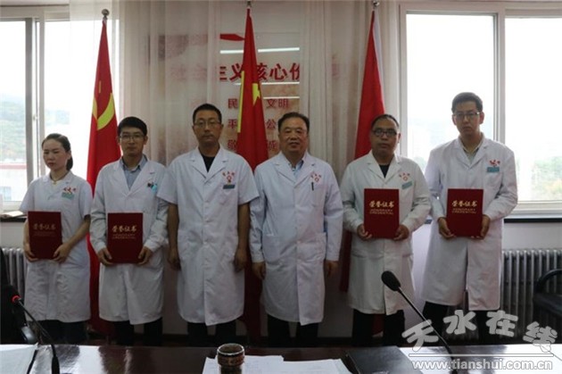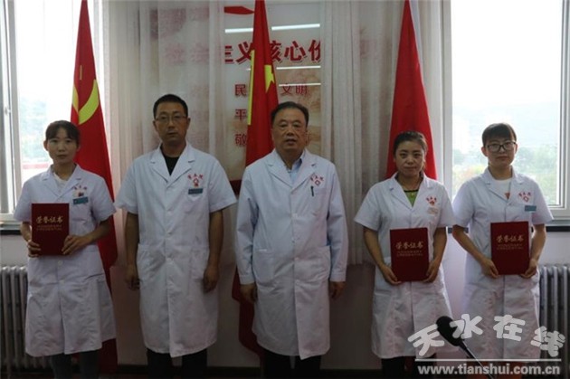宣誓結(jié)束后,縣錦春副院長宣讀了《甘肅省衛(wèi)生健康委員會關(guān)于通報表揚甘肅省優(yōu)秀醫(yī)師團(tuán)隊和優(yōu)秀醫(yī)師的決定》、《天水市衛(wèi)生健康委員會關(guān)于表彰2020年全市“優(yōu)秀醫(yī)師團(tuán)隊”和“優(yōu)秀醫(yī)師”的決定》、《天水市麥積區(qū)衛(wèi)生健康局關(guān)于表彰全區(qū)優(yōu)秀醫(yī)師團(tuán)隊和優(yōu)秀醫(yī)師的決定》及《天水市第五人民醫(yī)院關(guān)于表彰2020年優(yōu)秀醫(yī)師的決定》并對醫(yī)院推選受省衛(wèi)健委表彰的優(yōu)秀醫(yī)師團(tuán)隊一病區(qū),優(yōu)秀醫(yī)師高正明、丁如星、李永吉、張志亞、丁托蘭,受市衛(wèi)健委表彰的優(yōu)秀醫(yī)師團(tuán)隊二病區(qū),優(yōu)秀醫(yī)師魏利娜、張金芳、富春艷,受麥積區(qū)衛(wèi)健局表彰的優(yōu)秀醫(yī)師團(tuán)隊發(fā)熱門診,優(yōu)秀醫(yī)師黃海博、武潤科、張峰、白無瑕進(jìn)行了通報表揚;對我院評選出的竇海平、楊雪蓮、汪娟娟3名優(yōu)秀醫(yī)師進(jìn)行了表彰,院領(lǐng)導(dǎo)現(xiàn)場為他們頒發(fā)了榮譽證書。