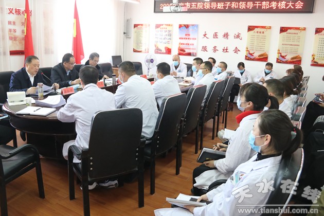 按照市委統(tǒng)一安排,2月2日,天水市第五人民醫(yī)院召開了2020年度領導班子和領導干部考核大會。天水市委第七考核組組長、二級巡視員黃嘯,副組長、一級調(diào)研員溫欽虎、市文明辦副主任魏立濤等一行6人對天水市第五人民醫(yī)院市管領導班子和領導干部以及黨風廉政建設、意識形態(tài)工作責任制落實情況進行了綜合考核。