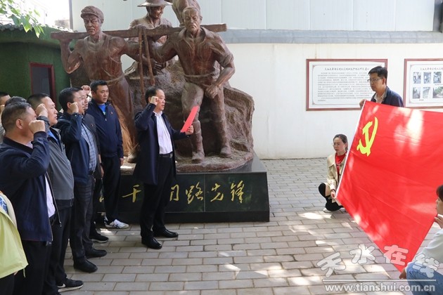 參觀結(jié)束后,全體黨員在紀(jì)念館雕塑前,面對(duì)黨旗,在黨總支書(shū)記、院長(zhǎng)潘臨平同志的帶領(lǐng)下重溫了入黨誓詞。