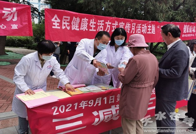 2021年9月是第15個“全民健康生活方式宣傳月”。今年的宣傳主題是:“三減+三健 健康新動力。”根據(jù)省衛(wèi)健委《關(guān)于開展2021年全民健康生活方式月宣傳活動的通知》精神,為深入推進以“三減三健”為主題的全民健康生活方式行動,進一步傳播和普及健康文明的生活方式,營造良好社會氛圍,9月23日上午,天水市疾控中心聯(lián)合秦州區(qū)疾控中心在人民公園開展了主題宣傳活動。市疾控中心吳毅中主任帶領(lǐng)班子成員參加了活動。