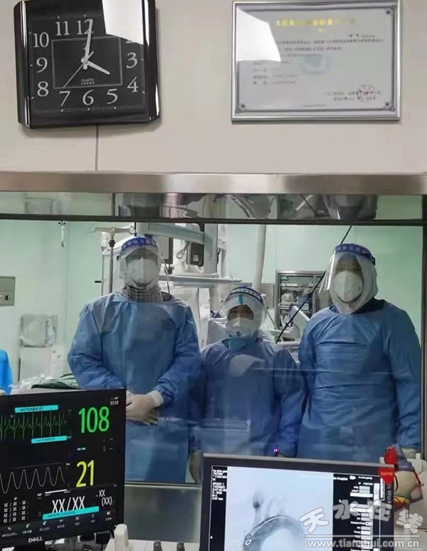 11月2日凌晨,一名江西40歲男性患者只身一人前來(lái)天水市第一人民醫(yī)院急診科就診,急性主動(dòng)脈夾層,破口較大,真腔受壓明顯,有明顯內(nèi)臟灌注不良,下肢已沒(méi)有血供,感覺(jué)障礙,情況危急,但家屬還遠(yuǎn)在千里之外的江西,核酸結(jié)果還未回報(bào),可病情刻不容緩。只有立即實(shí)施主動(dòng)脈夾層手術(shù),盡快拆除危及生命的“人體炸彈”,患者才有可能走出“鬼門(mén)關(guān)”。這種情況醫(yī)生很為難,一方面患者家屬遠(yuǎn)在江西,醫(yī)生無(wú)法與患者家屬進(jìn)行面對(duì)面的病情告知;另一方面,我們天水地區(qū)正處在新冠肺炎防控的關(guān)鍵時(shí)刻,其核酸檢測(cè)結(jié)果還需要等待。心血管外科齊胤尊主任即刻向醫(yī)院總值班及袁超院長(zhǎng)匯報(bào),院長(zhǎng)指示:“聯(lián)系患者家屬,啟動(dòng)應(yīng)急預(yù)案,采取新冠肺炎三級(jí)防護(hù)措施,立即實(shí)施主動(dòng)脈夾層手術(shù),全力以赴救治患者!”吃了定心丸的馬云鵬醫(yī)生破天荒的首次采用視頻術(shù)前談話,和家屬遠(yuǎn)程溝通,許可了患者本人簽字,在進(jìn)行充分流行病學(xué)調(diào)查的基礎(chǔ)上,嚴(yán)格按照疫情期間特殊患者處理流程,于凌晨2:30直接送入手術(shù)室,此時(shí)介入手術(shù)室的醫(yī)護(hù)人員已全副武裝準(zhǔn)備戰(zhàn)斗,微創(chuàng)手術(shù)在心血管外科主任齊胤尊和馬云鵬醫(yī)生的專(zhuān)注精心操作下順利完成,術(shù)后患者內(nèi)臟血供明顯改善,下肢血運(yùn)恢復(fù),目前病情穩(wěn)定,恢復(fù)情況良好!