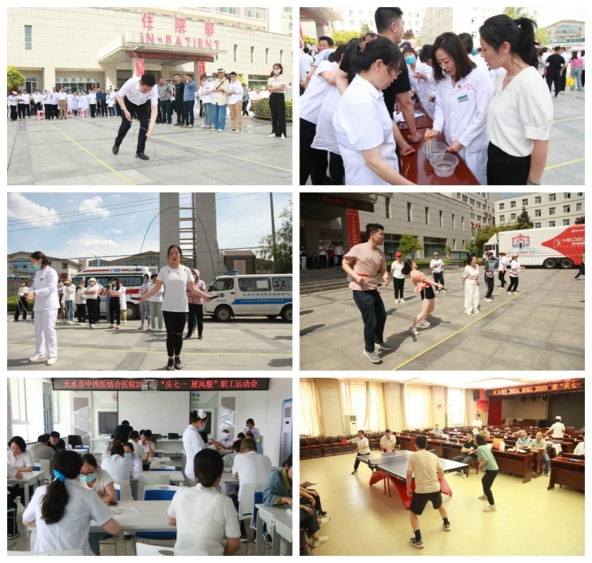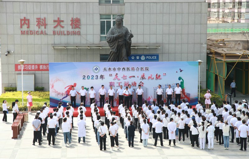 為大力弘揚全民健身的體育文化精神,激發(fā)廣大職工開拓進取的工作熱情,增強凝聚力、向心力,展現(xiàn)醫(yī)務(wù)人員頑強拼搏、團結(jié)奮進的良好精神風(fēng)貌,6月14日,天水市中西醫(yī)結(jié)合醫(yī)院(市二院)在院本部舉辦2023年“慶七一·展風(fēng)貌”為主題的職工運動會。特邀市衛(wèi)健委黨組書記、主任王定新,麥積區(qū)委常委、組織部部長王軍龍和區(qū)衛(wèi)健局黨組書記、局長陶俊杰及區(qū)總工會黨組書記、主席裴利杰出席開幕式。開幕式由院黨委副書記、院長唐志鋒主持。院領(lǐng)導(dǎo)和運動員、裁判員及職工代表200余人參加了開幕式。