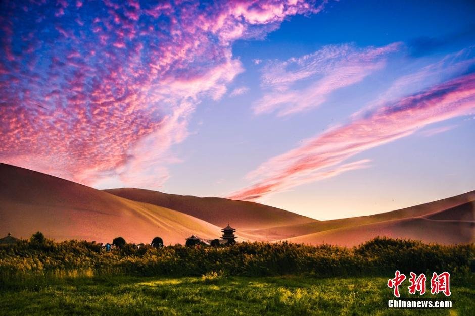 連續(xù)三天來,國際旅游名城甘肅敦煌出現大漠火燒云奇觀。傍晚時分,朵朵白云聚攏在天邊,隨著太陽西沉,濃密的云層被霞光渲染成了橘黃、淡紅、深紅等奇異色彩,并隨著霞光慢慢淡化、直至消失在西邊的天空,這種罕見的火燒云奇觀引得眾多游客驚嘆叫絕,紛紛駐足觀看,并用手中的相機、手機等拍下難得一見的珍貴景象。圖為8月10日,敦煌鳴沙山月牙泉景區(qū)出現大漠火燒云的壯美景象。 王斌銀 攝