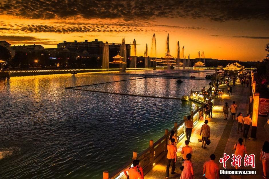 圖為8月12日,游客在火燒云籠罩的敦煌黨河風情線觀光游覽。 王斌銀 攝 |