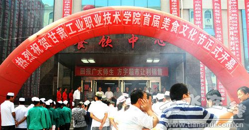 為豐富校園文化生活,倡導(dǎo)營養(yǎng)、健康的膳食理念,營造整潔、文明、舒適的餐飲環(huán)境,推動高校餐飲文化建設(shè),2010年8月28日,甘肅工業(yè)職業(yè)技術(shù)學(xué)院首屆美食文化節(jié)拉開了序幕,為2010級新生報到第一天人潮涌動的校園平添了一份喜慶氣息。