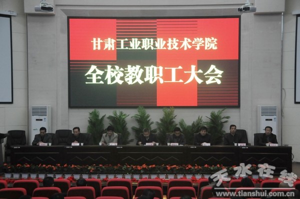 3月11日下午,甘肅工職學(xué)院2013年春季學(xué)期全校教職工大會(huì)在該校圖書館5樓會(huì)議廳舉行。校領(lǐng)導(dǎo)班子和全體教職員工參加了大會(huì),校長(zhǎng)曹愛明在大會(huì)上講話,黨委副書記郭建忠主持會(huì)議。