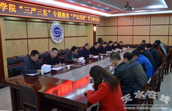 11月17日上午,甘肅機(jī)電職業(yè)技術(shù)學(xué)院黨委在二樓會(huì)議室召開(kāi)“三嚴(yán)三實(shí)”專題教育“嚴(yán)以用權(quán)”學(xué)習(xí)研討會(huì)。黨委書記李宗義主持會(huì)議并講話。學(xué)院領(lǐng)導(dǎo)班子成員、黨委工作部副部長(zhǎng)、各黨支部書記、各系部主任和有關(guān)科室負(fù)責(zé)人參加會(huì)議。