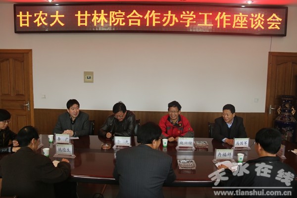 11月23日,甘肅農(nóng)業(yè)大學(xué)副校長(zhǎng)趙興緒帶領(lǐng)教務(wù)處、招生就業(yè)處和林業(yè)學(xué)院的負(fù)責(zé)人一行6人,到甘肅林職學(xué)院就兩校合作辦學(xué)工作進(jìn)行了座談;林職學(xué)院院長(zhǎng)陳逸平、副院長(zhǎng)姚德生、冉福祥,辦公室、招生就業(yè)處、林業(yè)工程系、園林工程系的負(fù)責(zé)人參加了座談會(huì)。