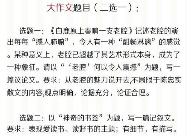 今年北京高考語(yǔ)文大作文題為二選一:①“老腔”何以讓人震撼;②“神奇的書(shū)簽”