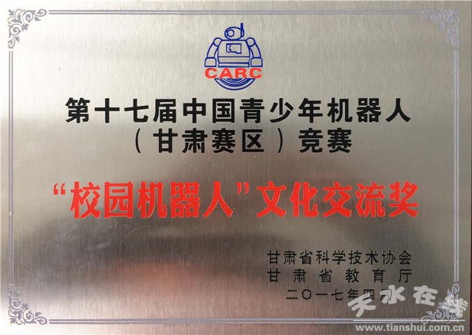 市一中馬伏櫪、王澤坤同學(xué)榮獲“機(jī)器人WER工程賽”高中組冠軍,郭永亮、王萱同學(xué)榮獲“機(jī)器人綜合技能比賽”高中組季軍,崔永佳老師榮獲“優(yōu)秀科技輔導(dǎo)員方案”一等獎(jiǎng),天水一中獲“第十七屆中國(guó)青少年機(jī)器人(甘肅賽區(qū))競(jìng)賽‘校園機(jī)器人’文化交流獎(jiǎng)”。