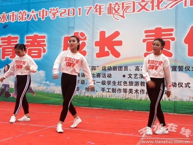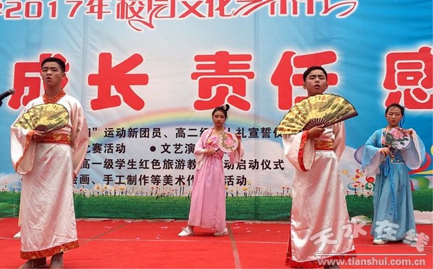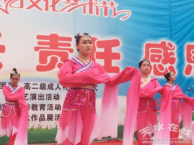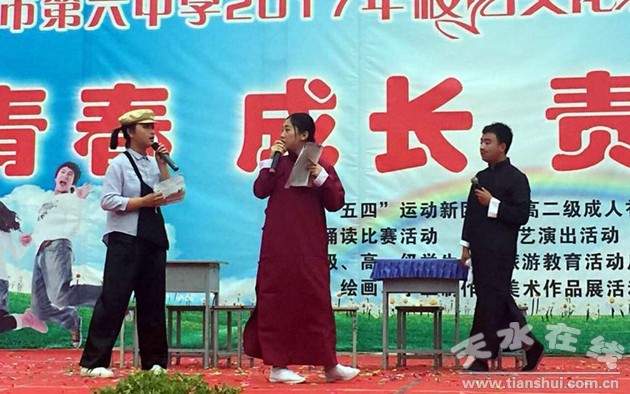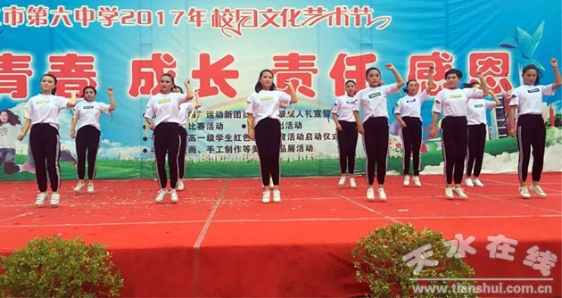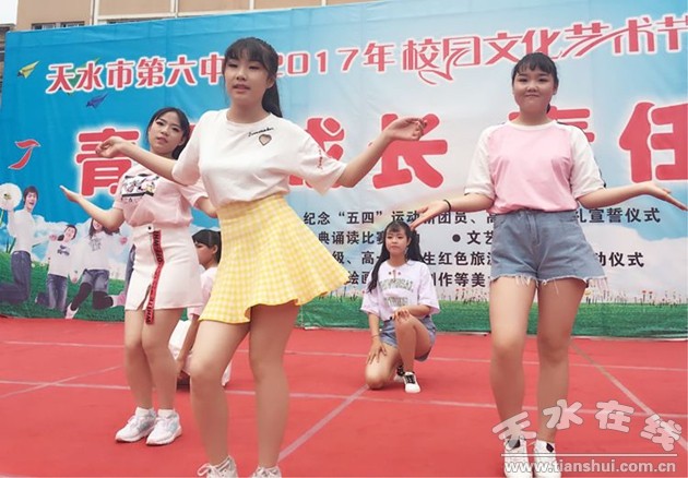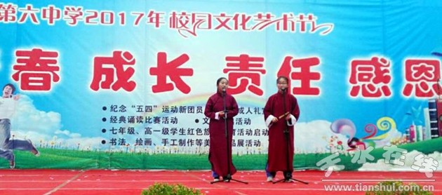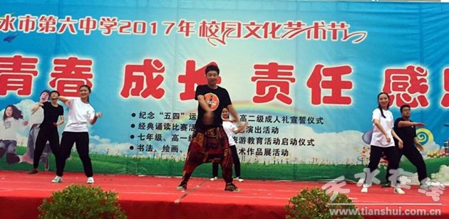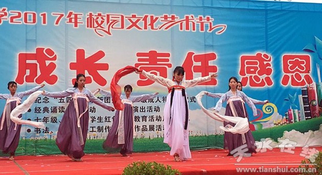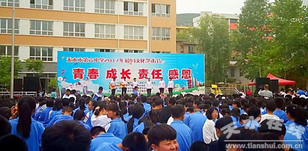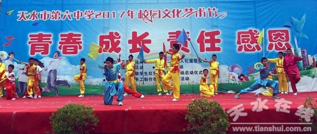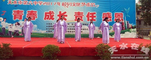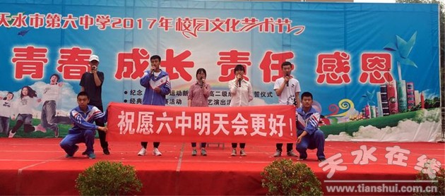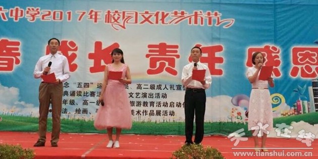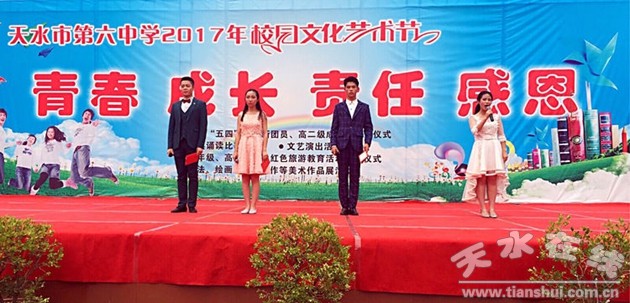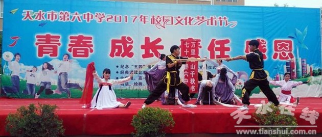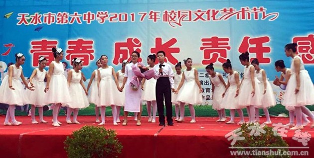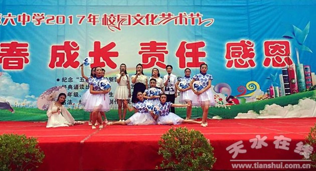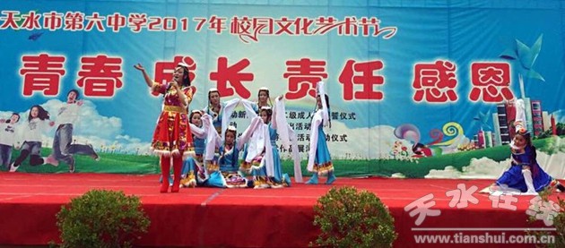 為了進(jìn)一步激發(fā)學(xué)生對(duì)藝術(shù)的興趣愛好,陶冶學(xué)生的情操、豐富學(xué)生的知識(shí),發(fā)展他們的才能,培養(yǎng)和提高同學(xué)們欣賞美、創(chuàng)造美的能力,使同學(xué)們?cè)谟鋹、向上的校園文化環(huán)境中活潑健康地成長,形成良好的校園文化氛圍,6月2日天水市第六中學(xué)舉行了以"青春、成長、責(zé)任、感恩"為主題的2017年校園文化藝術(shù)節(jié)文藝匯演活動(dòng)。