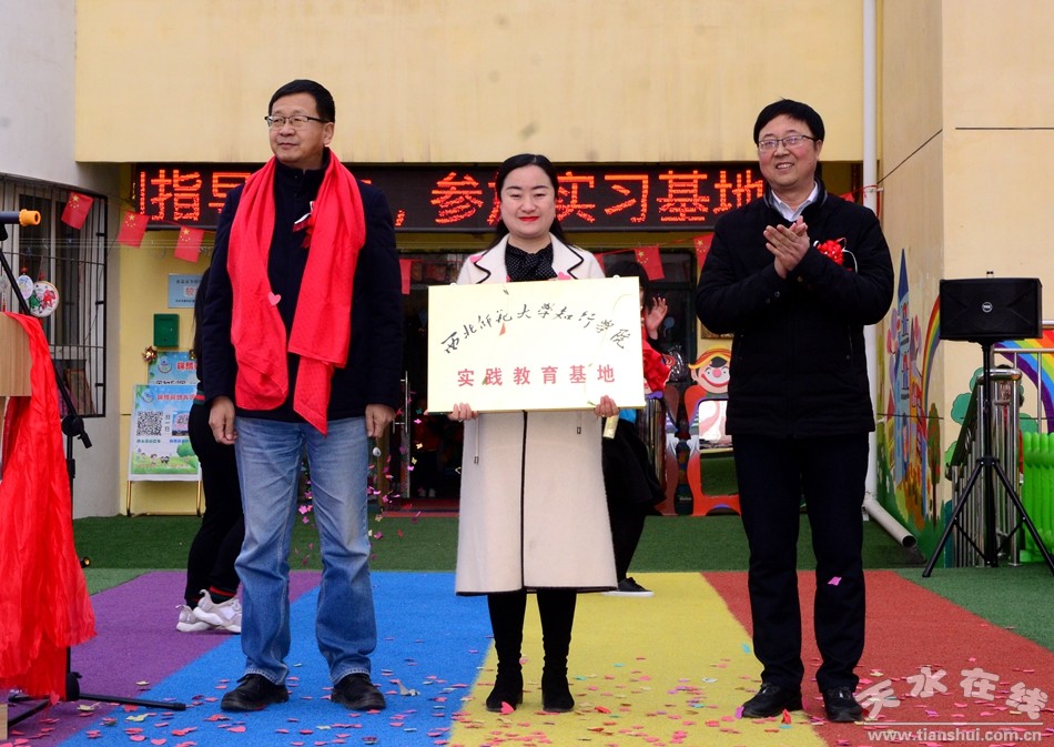 為加強實踐教學(xué),培養(yǎng)具有較強實踐能力和創(chuàng)新精神的高素質(zhì)應(yīng)用型人才,西北師范大學(xué)知行學(xué)院教育管理系與天水市秦州區(qū)錦繡苑幼兒園本著“資源共享、互惠互利、共同發(fā)展”的原則,經(jīng)過長期的考察和協(xié)商,合作共建“西北師范大學(xué)知行學(xué)院學(xué)前教育專業(yè)實踐教育基地”。2018年11月27日上午10時,雙方負責(zé)人在錦繡苑幼兒園舉行實習(xí)基地掛牌儀式,正式建立戰(zhàn)略合作關(guān)系。