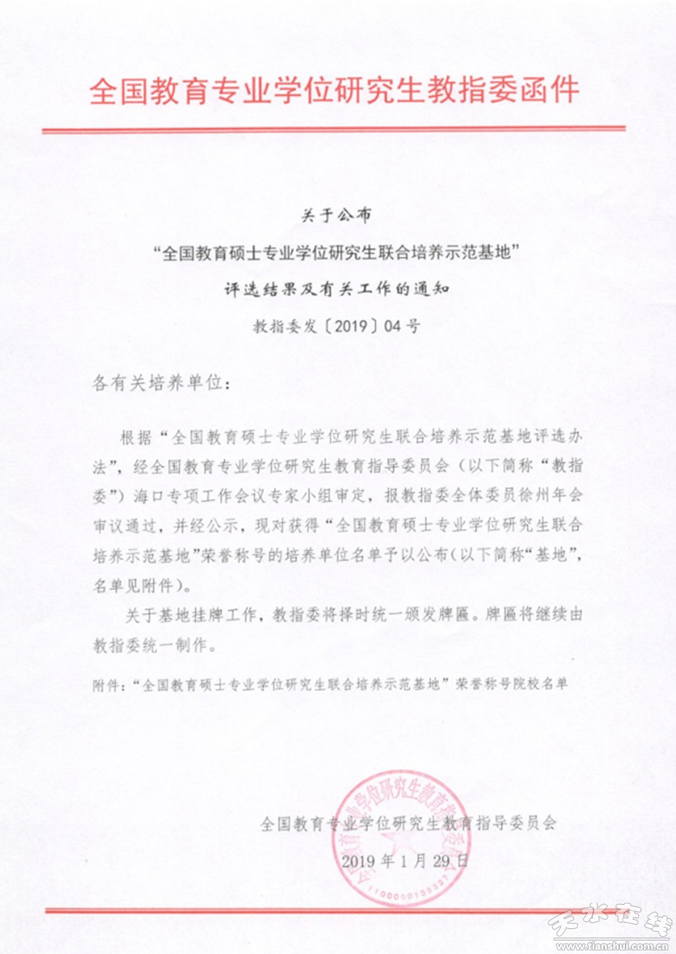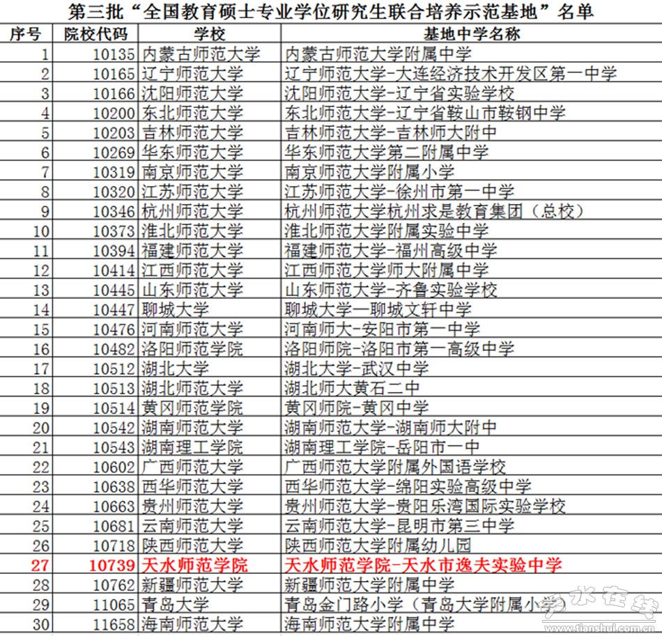 1月29日,全國教育專業(yè)學(xué)位研究生教育指導(dǎo)委員會公布了獲得“全國教育碩士專業(yè)學(xué)位研究生聯(lián)合培養(yǎng)示范基地”榮譽(yù)稱號的培養(yǎng)單位名單,其中,天水師院教育碩士專業(yè)學(xué)位研究生聯(lián)合培養(yǎng)基地——天水市逸夫?qū)嶒?yàn)中學(xué)獲此殊榮。本次全國共評選出30所教育碩士聯(lián)合培養(yǎng)示范基地單位,天水師院是甘肅省唯一獲此殊榮的高校。