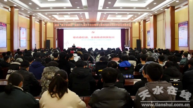 12月18日上午,省委教育工委、省委講師團(tuán)“博士宣講團(tuán)”黨的十九屆五中全會(huì)精神宣講報(bào)告會(huì)在甘肅機(jī)電學(xué)院舉行!安┦啃v團(tuán)”成員、蘭州交通大學(xué)紀(jì)委監(jiān)察二室副主任、副教授王映予博士作宣講報(bào)告,學(xué)院思政課教師和學(xué)生代表200余人聆聽。宣講報(bào)告會(huì)由黨委宣傳統(tǒng)戰(zhàn)部負(fù)責(zé)人主持。