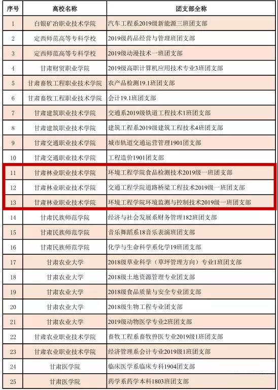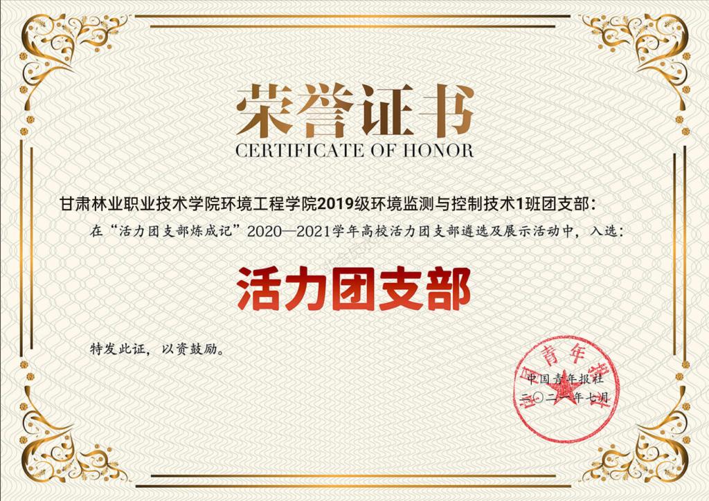 經(jīng)校級(jí)申報(bào)、省級(jí)初評(píng)、展示點(diǎn)贊、全國(guó)終審、名單公示等環(huán)節(jié),遴選產(chǎn)生了1000個(gè)高;盍F(tuán)支部。經(jīng)評(píng)選,甘肅林業(yè)職業(yè)技術(shù)學(xué)院環(huán)境工程學(xué)院團(tuán)總支2019級(jí)環(huán)境監(jiān)測(cè)與控制技術(shù)一班團(tuán)支部榮獲全國(guó)高!盎盍F(tuán)支部”榮譽(yù)稱號(hào),2019級(jí)環(huán)境監(jiān)測(cè)與控制技術(shù)一班團(tuán)支部、2019級(jí)食品檢測(cè)技術(shù)一班團(tuán)支部、交通工程學(xué)院2019級(jí)道路橋梁工程技術(shù)一班團(tuán)支部獲甘肅省“活力團(tuán)支部”榮譽(yù)稱號(hào)。環(huán)境工程學(xué)院團(tuán)總支獲天水市“五四紅旗團(tuán)總支”榮譽(yù)稱號(hào)。