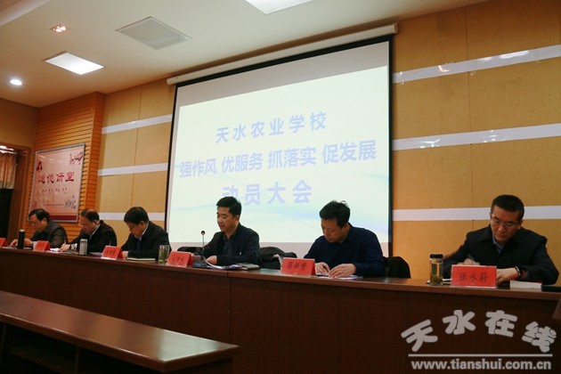 為認(rèn)真落實(shí)市委及市教育局作風(fēng)建設(shè)年活動(dòng)工作部署,2月27日,天水農(nóng)業(yè)學(xué)校召開“強(qiáng)作風(fēng)、優(yōu)服務(wù)、抓落實(shí)、促發(fā)展”作風(fēng)建設(shè)年活動(dòng)動(dòng)員大會(huì)。會(huì)議由黨委書記文建水主持。黨委副書記、校長(zhǎng)朱建章作了動(dòng)員講話。紀(jì)委書記蘇永紅宣讀了《天水農(nóng)業(yè)學(xué)!皬(qiáng)作風(fēng)、優(yōu)服務(wù)、抓落實(shí)、促發(fā)展”作風(fēng)建設(shè)年活動(dòng)實(shí)施方案》。學(xué)校其他班子成員和全體教職員工180余人參加會(huì)議。
