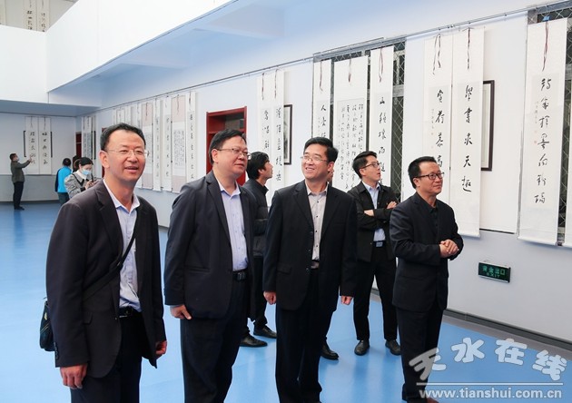 開幕式后,與會(huì)領(lǐng)導(dǎo)和嘉賓參觀了書法展。本次展出的郭治川先生書法作品,大氣磅礴,異彩紛呈,既是郭先生藝術(shù)成就的集中展示,更是對(duì)郭先生耕耘杏壇,書文臨池,文以載道精神的傳承。書法內(nèi)容百分之九十是郭先生自創(chuàng)的詩(shī)聯(lián),作品詩(shī)書俱佳,匠心獨(dú)具。內(nèi)容與形式完美結(jié)合,一筆一劃盡顯其深厚的功力、執(zhí)著的情懷,一詞一句浸潤(rùn)著他對(duì)清水家鄉(xiāng)的赤誠(chéng)熱愛和對(duì)天水農(nóng)校的真情牽掛。從中可以真切感受到郭治川先生深深的眷戀之情和濃濃的反哺之意。尤其有清水景點(diǎn)、文俗、特產(chǎn)、地名等方面內(nèi)容的就更加接地氣,更加體現(xiàn)清水特色,展現(xiàn)時(shí)代精神。